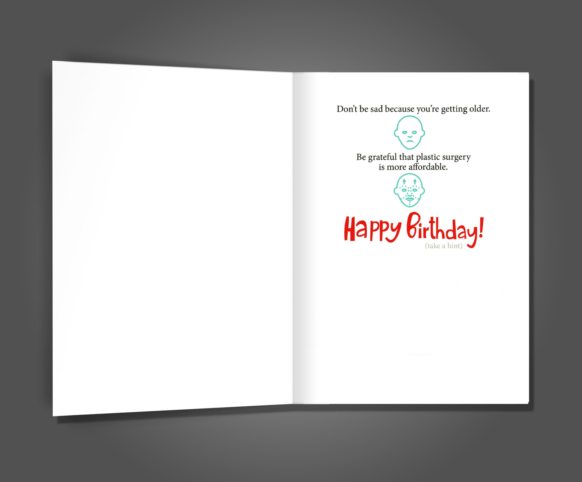 INSIDE WORDING: Don't be sad because you're getting older. Be grateful that plastic surgery is more affordable. Happy Birthday (take a hint)