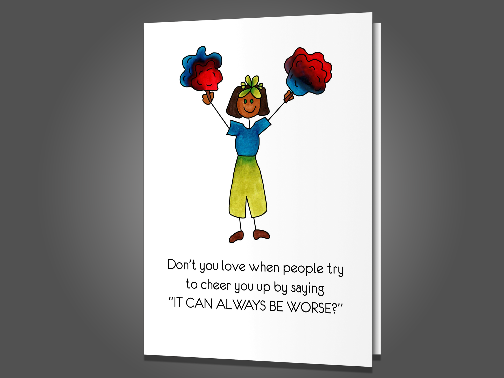 DETAILS: Hand-drawn, painted with watercolors and digitally edited greeting card for that person in your life that can take a joke and doesn’t take life too seriously. Or if you simply want a card to cut through the bullshit of sappy cheesy alternatives.