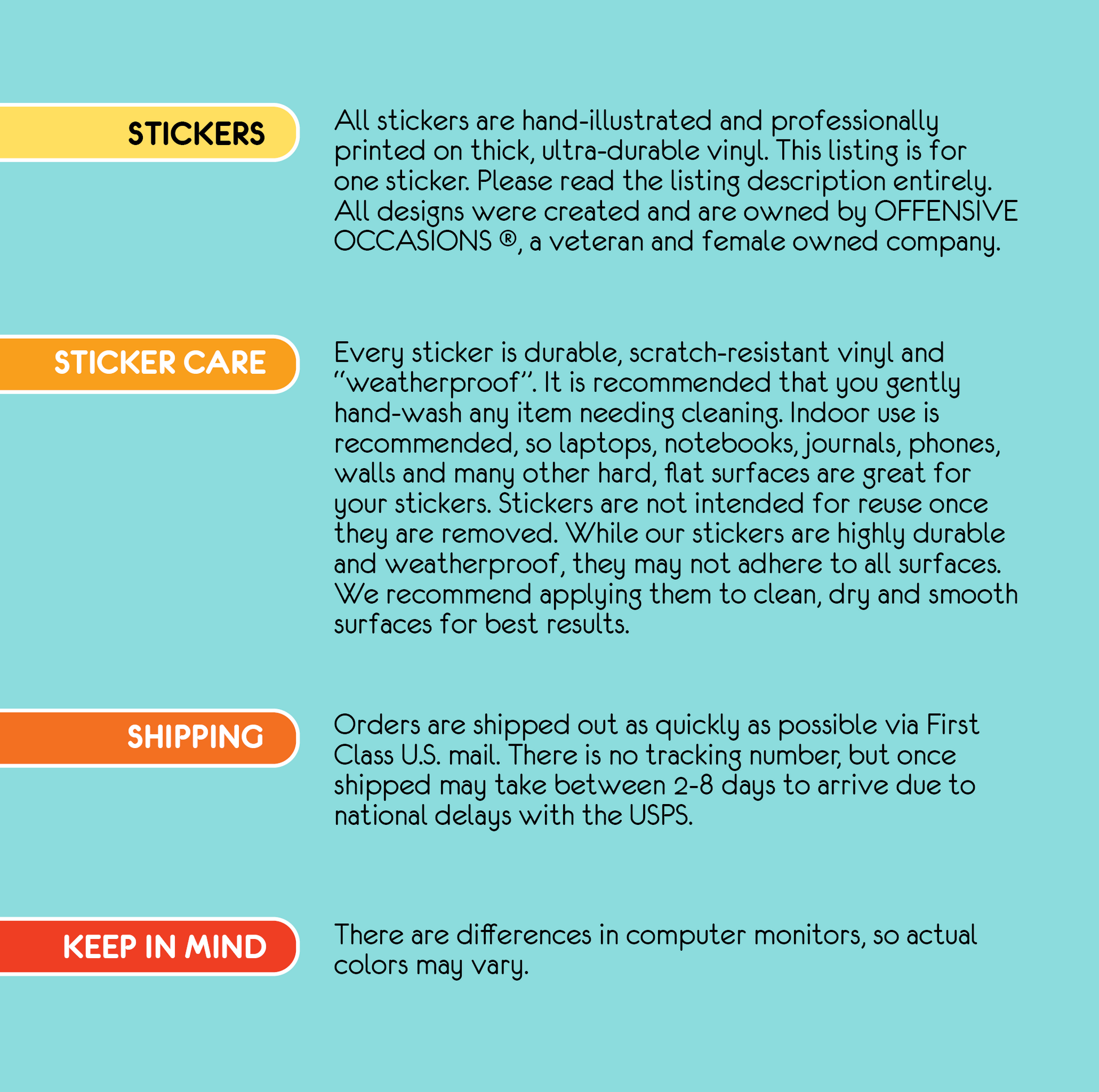 MATERIALS: All stickers are hand-illustrated and professionally printed on thick, ultra-durable vinyl. This listing is for one sticker. Please read the listing description entirely. All designs were created and are owned by OFFENSIVE OCCASIONS ®, a veteran and female owned company.